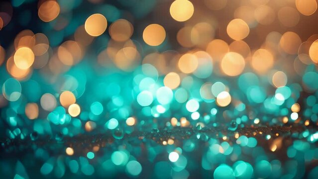 Abstract teal and gold bokeh lights creating a festive and luxurious atmosphere. Soft focus circles of light blend seamlessly to evoke feelings of celebration and elegance.