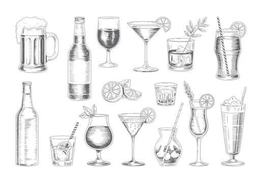 Cocktail and drink glass collection in vintage sketch style. Classic mixed drinks and glassware illustration bundle in line art.