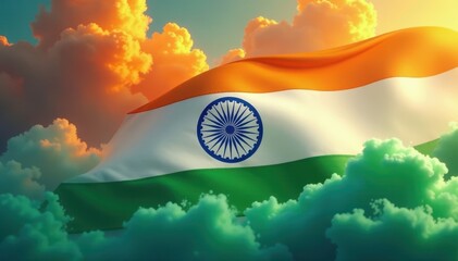 Vast colorful clouds morph into majestic Indian flag with saffron orange yellow and green hues blending in the sky , orange, clouds