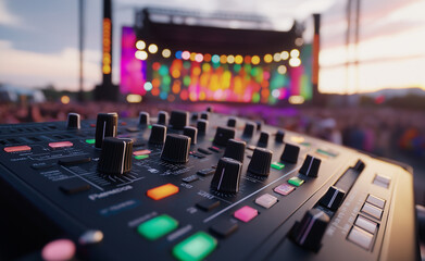 Sound engineer at a mixing console during a live music concert. Audio technician working at an outdoor festival in front of a large crowd and stage.