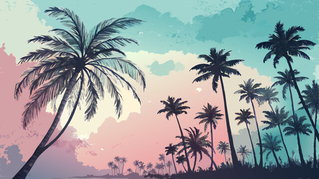 *"Watercolor Palm Tree Silhouette Background – Soft Pastel Gradient Sky with Tropical Festival Vibes, Laid-Back Summer Aesthetic