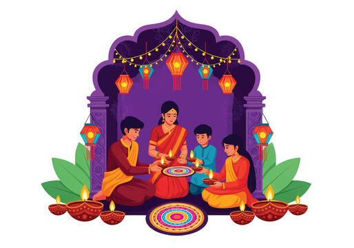 Flat style illustration of an Indian family celebrating Diwali by lighting diyas around a rangoli, surrounded by lanterns and garlands, symbolizing unity, joy, and the spirit of the festival of lights