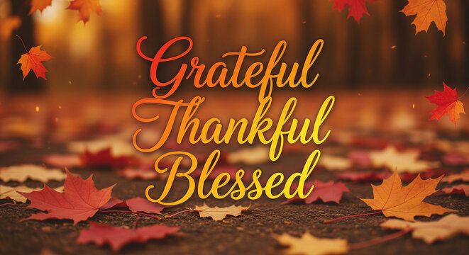 Grateful Thankful Blessed Text on Autumn Bokeh Background