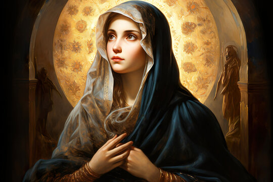 Portrait of Mary with Baby Jesus, Blurred Background with Copy Space