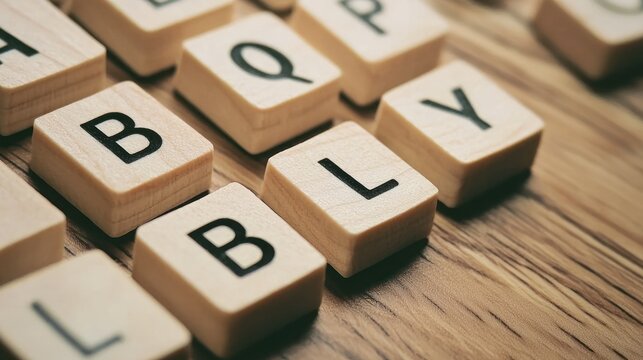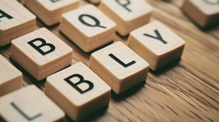 Wooden letter tiles spelling out the word 'BLY' on a wooden surface.