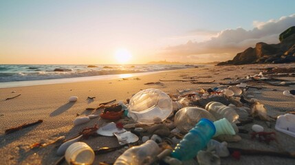 Plastic litter washed up onto the sand of the beach during sunset