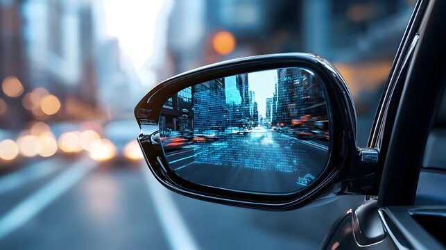 Modern Car Mirror with Digital Blind Spot Warning Overlay and Urban Street Reflection