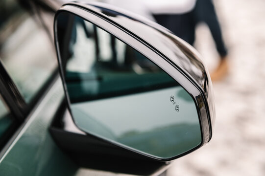 Blind zone monitoring sensor on the side right mirror of a new modern electric sedan car. View of the side mirror shows the light of blind spot to notice driver beware before changing lanes. Closeup.