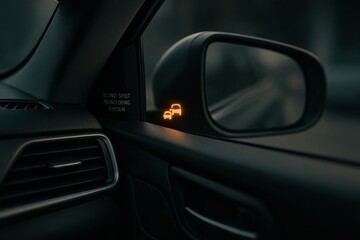 Blind spot monitoring system warning icon illuminated in a car side mirror.