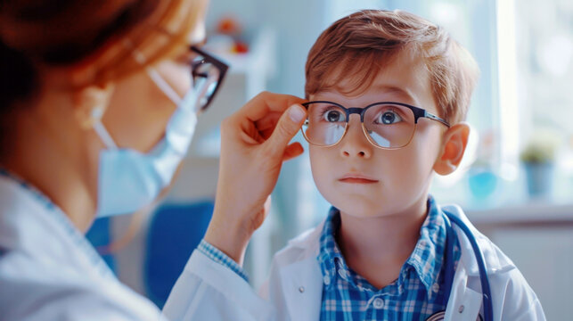 World Sight Day. A child at an ophthalmologist's appointment. Doctor trying on glasses for boy. Problems of blindness and visual impairment, prevention of eye diseases. Eyesight check. Oftalmology Day