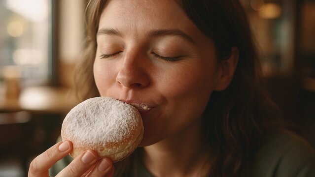 Young woman savoring the sweet taste of a powdered donut, eyes closed in blissful enjoyment while taking a bite in a cozy cafe, surrounded by warm light and inviting aromas