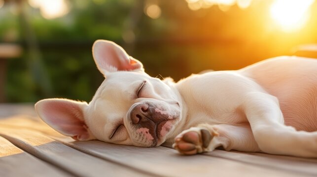 A adorable puppy enjoys a blissful nap under the glowing sunlight on a wooden surface, encapsulating warmth and innocence, evoking feelings of peace and pure joy.