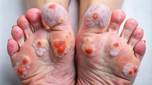 Large, painful blisters on the feet feature inflamed red skin with noticeable white lesions and clear fluid-filled pockets creating a tender, discolored appearance.
