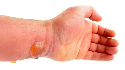 Blisters on the skin. On his feet in sunny weather, blisters on his hip.