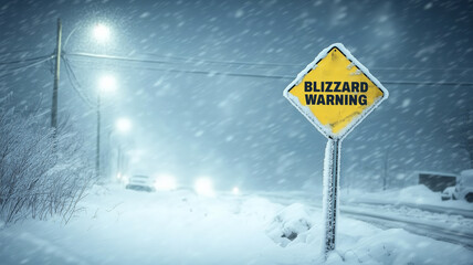 Snow-covered blizzard warning sign harsh winter driving conditions
