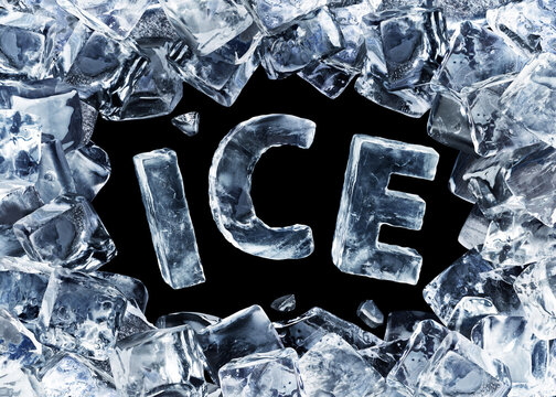 Icy lettering Ice surrounded by ice cubes on a black background.