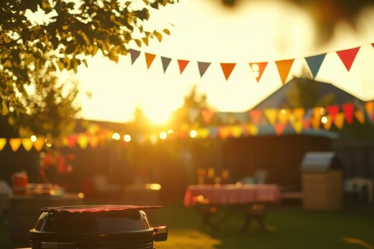 Families at neighborhood block party on sunny street. Children play games, adults chat by food stalls. Colorful bunting strung between trees adds cheerful festival atmosphere. Experiencing community