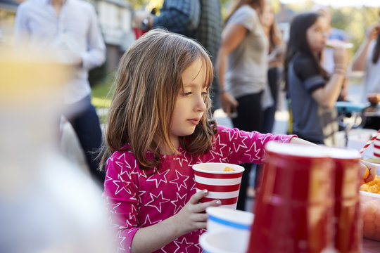 Four year old girl helping herself to food at a block party