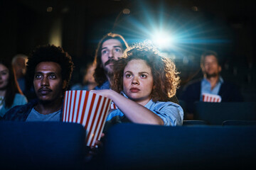 Group of diverse young people watching a movie in cinema with popcorn