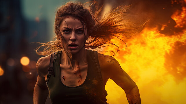 Action shot with woman on the run. Dynamic scene in action movie blockbuster style.