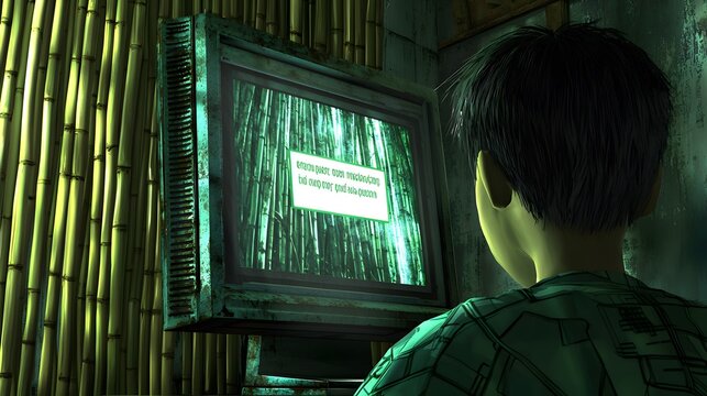 Person looking at a computer screen displaying a blocked website message with a bamboo curtain background. The Great Firewall of China. Copy space.