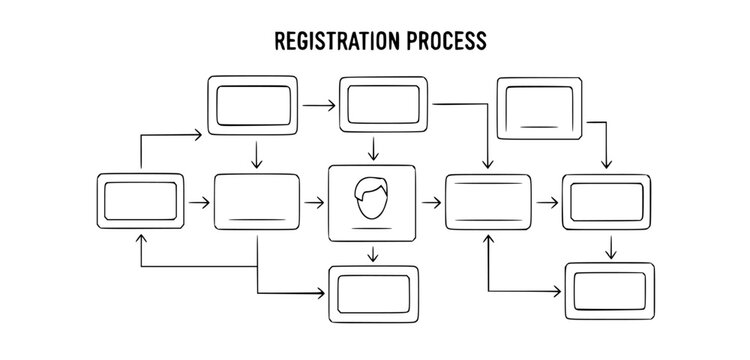 Registration process flowchart diagram with user profile and multiple steps, isolated on white background