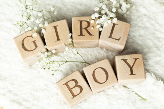 Wooden blocks spelling out the words GIRL and BOY lying flat on a white, fluffy blanket with white flowers.  Baby gender reveal cubes for baby shower and photoshoot.