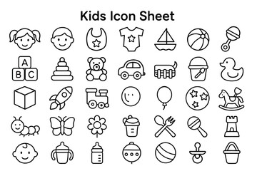 Kids Icon Sheet: A collection of simple and charming icons depicting various aspects of childhood, from toys and playthings to essential items. Ideal for designs related to children.
