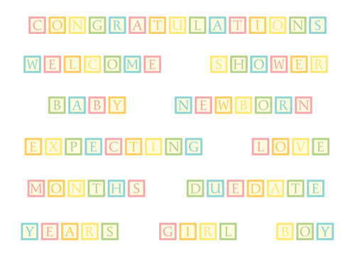 Cute baby shower frames with colorful bunting, polka dots, and alphabet blocks spelling GIRL, BOY, and BABY. Perfect for gender reveal announcements, invitations, or baby themed designs.