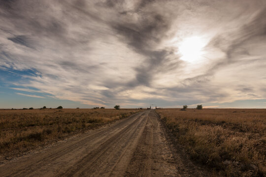 A horizontal shot of a rural dirt road in bisecting two farms, against a backdrop of a dramatic, sormy, cloudy sky at susnet, Bloemfontein, Free State, South Africa