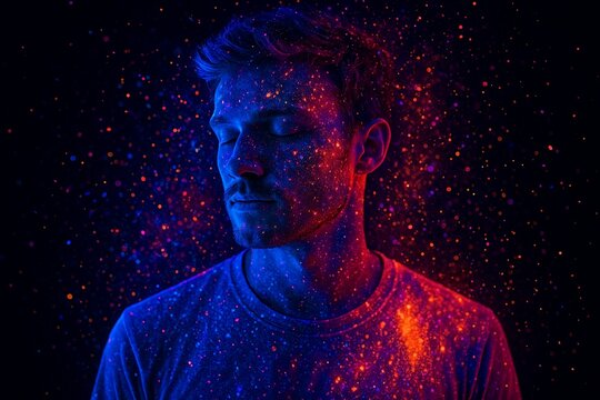 Young man dreaming with neon glowing powder on dark background
