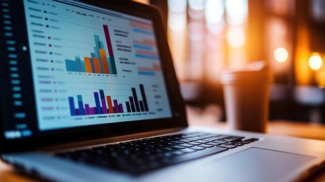 Closeup screen of the laptop or notebook device, displaying the colorful website traffic metrics, graphs and analytics for the ranking of the blog on the internet or web online.