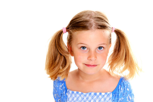 Close up rear- vew portrait of a cute little girl with funny pigtails on white background. Fashion and happy childhood.