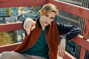 Young blond male sitting on roof of building
