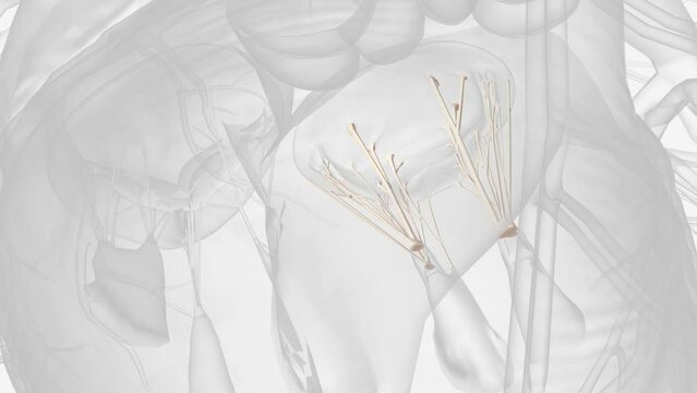 3D rendering of human leg anatomy with visible blood vessels highlighted in red on a dark background