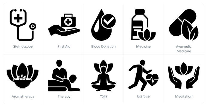 A set of 10 mix icons as stethoscope, first aid, blood donation