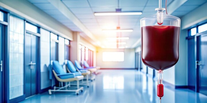 A blood bag in a hospital setting, with medical staff in the background, emphasizes the critical role of blood donation in healthcare and saving lives