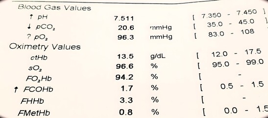 Medical report showing blood gas and oximetry values with reference ranges, highlighting respiratory status, metabolic function, and clinical diagnostics.