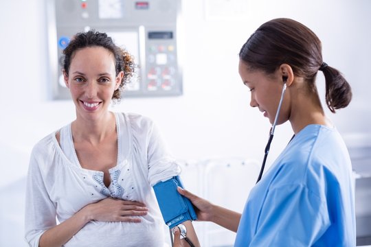 Doctor checking blood pressure of pregnant woman