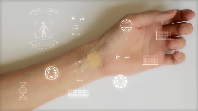 Smart patch shows health status such as temperature blood pressure heartbeat and etc. with moving elements on white background. Concept of futuristic medicine