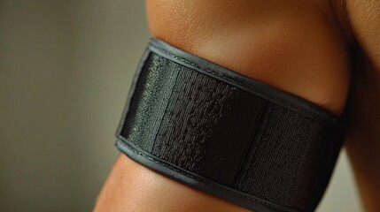 Macro view of a blood pressure cuff wrapped around an arm