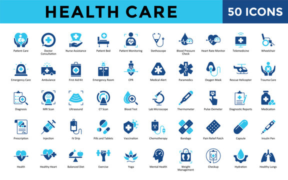 Health Care icons set with patient care, doctor consultation, nurse assistance, patient bed, patient monitoring, stethoscope, blood pressure check, heart rate monitor icon. Simple flat vector