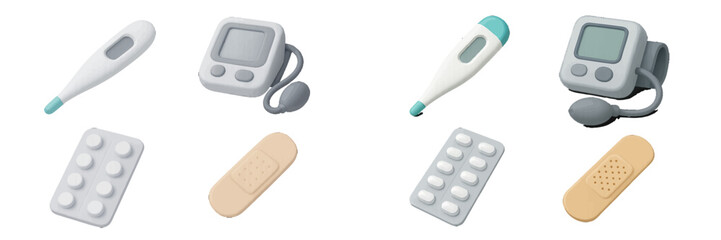 Medical Equipment: Thermometer, Blood Pressure Monitor, Pills, Bandage. Modern 3D Icon Set