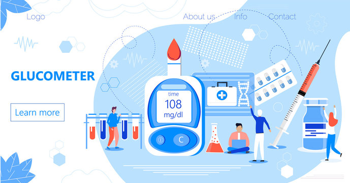 Glucometer for measuring sugar level of diabetics. Landing page with blood glucose testing meter, tiny doctors. Type 2 diabetes and insulin productio