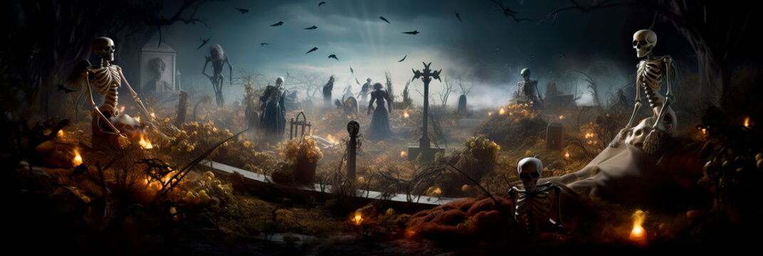 A mysterious full moon shines over an ancient Gothic cemetery, enveloped in thick fog and ominous clouds. The eerie scene is illuminated by blue moonlight, casting shadows across the graveyard. A larg