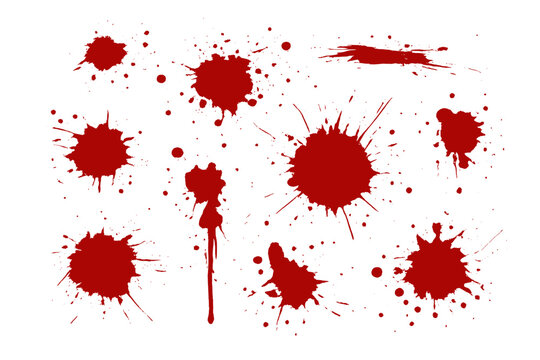 Collection of red blood splatters, handprints, drips, and stains. Suitable for horror, crime, medical, or artistic design projects. High-contrast, vivid red graphics on white background.