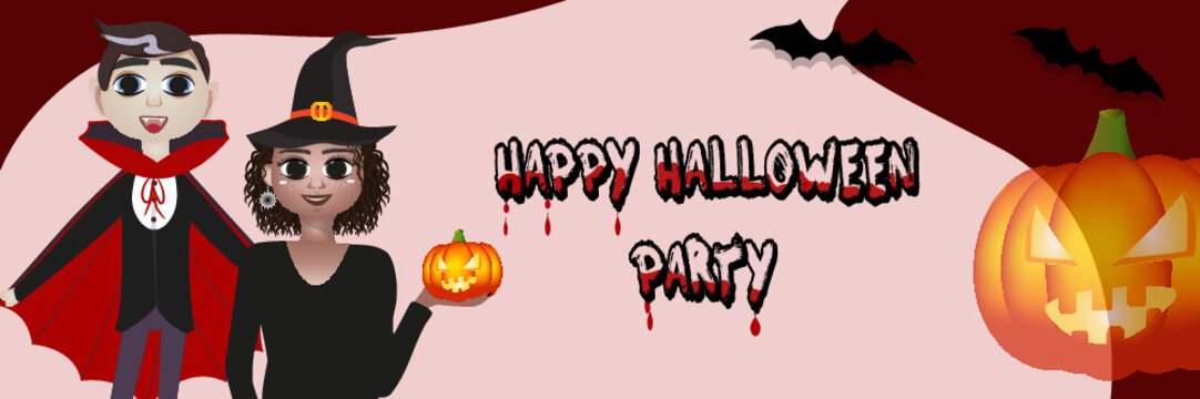 HappyHalloween party invitation with pumpkin, witch, vampire, bat and bloody letters