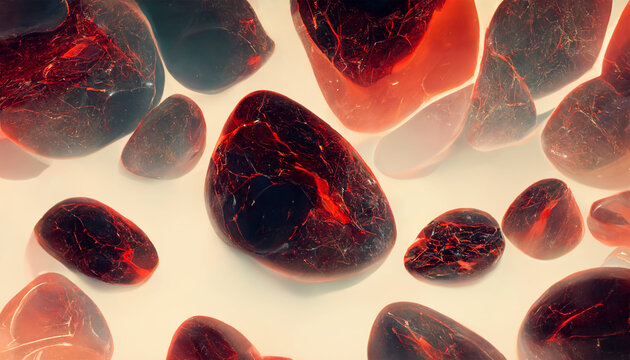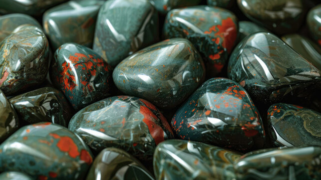 A mesmerizing image featuring a heap of polished bloodstone gemstones with distinctive red markings, captured in close-up