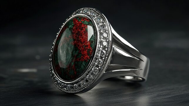 A bold ring featuring a deep green bloodstone with red flecks, framed by diamond accents on a rugged silver band. Ideal for masculine fashion, jewelry, and luxury designs.