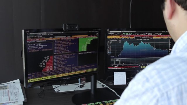 A close-up photograph from behind of trading monitors displaying stock market graphs, vibrant and dynamic charts, multiple screens